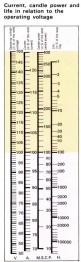 Electric Data ( Glossary )Design volts (V) show the voltage at which a lamp is designed for rated ampere, candlepower and laboratory-life characteristics. Design amperes (mA) are the current flowing through a lamp when operated at its design voltage. It is subject to nominal manufacturing tolerances ± 10 % Mean spherical candle power (MSCP) The MSCP is the generally accepted method used to indicate the brightness of miniature lamps; it is the total value emitted from a lamp placed at the center of a circle having a specified diameter. The standard lamp calibrated by National Bureau of Standards is used in determining this value. MSCP can be converted into lumens by multiplying MSCP by 4 π pi (12,57 × MSCP = lumens ) Average laboratory life (h) Lifetime indicated is based upon test data recorded under strictly controlled laboratory conditions. Under normal operating conditions, however, lifetime may be shorter due to factors such as voltage fluctuation, shock, vibration, temperature, and other environmental and operation conditions. MOL (Maximum Overall Length) MOL is measured from the bottom of the base ( or bottom of glass tip for unbased lamps) to the top of the envelope. MOD (MaximumOutside Dia.) MOD is a measurement across the largest part of the envelope. LCL (Light Center Length) LCL is a measurement from the geometric center of the filament to : Flange Base - top of flange, Grooved Base - center of groove, Bi-Pin Base - flat bottom, Screw Base - bottom of center contact, Bayonet Base - top of base pin, Wedge Base - center of notch, SC or DC Prefocus Base -bottom of indentations on prefocus collar, Wire Terminal - not specified. Filament Shapes The filament is the light emitting portion of the lamp. Its configuration is identified by the prefix letter - S for straight, C for coiled and CC for coiled coil ( double coil). Quality Control The lamp features highly reliable design for life-, vibration-, shock-, drop-, vacuum-, and atmospheric resistance- testing to ensure durability. Life test Life time of lamps is generally determined by the following equation. IEC Specification (International Electrical Commission) "Tungsten Filament Lamps for General Use" The equivalent life for rated voltage shall be determined in accordance with the following equation. Lo = L ( V ÷ Vo ) n Lo ............................Life at rated voltage L .............................Life at test voltage Vo ............................Rated voltage V ..............................Average voltage during life test n = 13 vacuum lamps; 14 gas filled lamps IES Specification (Illumination Engineering Society) "Lighting Hand Book" Lo = L ( V ÷ Vo ) n n = 13.5 vacuum lamps; 13.1 gas filled lamps Vibration test All specification requirements must be met before and after vibration for 30 minutes. The test condition :